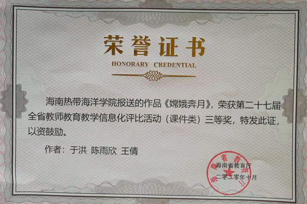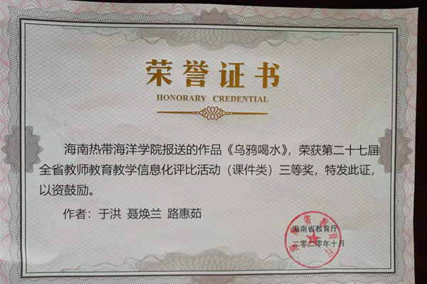 近日,由海南省教育厅主办的“第二十七届全省教师教育教学信息化评比活动”结果正式揭晓,我院于洪老师指导的参赛作品《乌鸦喝水》(学科:语文)和《嫦娥奔月》(学科:语文)荣获课件类三等奖。