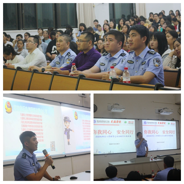 10月28日晚,我院在五指山校区举办“你我同心 安全同行”安全教育专题讲座。讲座邀请了五指山市河南派出所浦小亮指导员、五指山市公安局刑警支队黎昀昊警官担任主讲嘉宾,学院党委书记陈石研,河南派出所所长陈俊海、河北派出所所长王永富,以及五指山校区全体辅导员和新生代表到场聆听讲座。